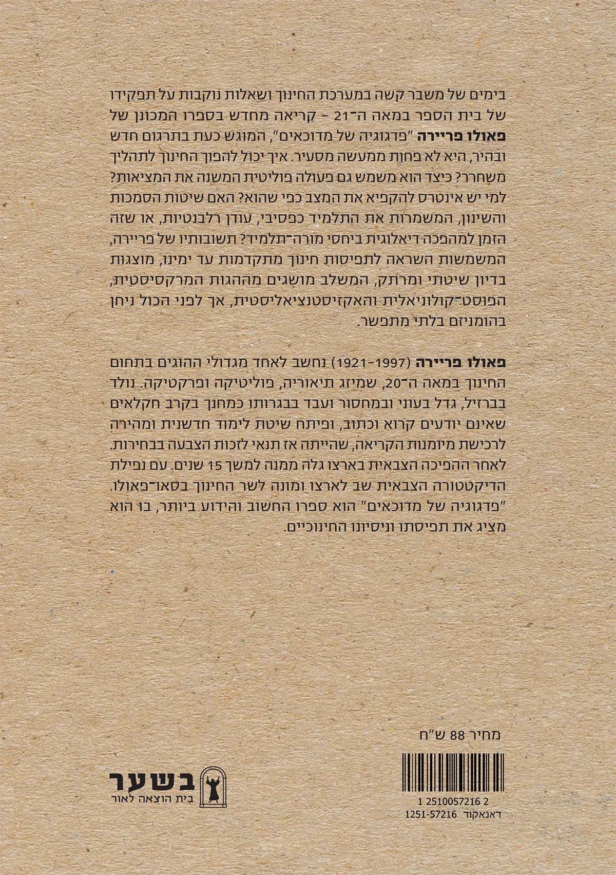 בימים שבהם מערכות החינוך מתמודדות עם משברים עמוקים ושאלות נוקבות על תפקיד בית הספר במאה ה-21, הקריאה בפריירה הופכת להכרחית עבור אנשי חינוך, סטודנטים ופעילים חברתיים. הספר מזמין אותנו לבחון למי יש אינטרס בשימור המצב הקיים ולמי יש אינטרס בשינויו, ומציע כלים לפיתוח תודעה ביקורתית המסוגלת לחשוף את מנגנוני הדיכוי המוסווים במבנה החברתי. המהדורה הנוכחית בתרגומה של כרמית גיא ובעריכתו של רמי לבני, מנגישה את הטקסט המורכב והעשיר לשפה העברית המודרנית תוך שמירה על הדיוק המושגי של פריירה.